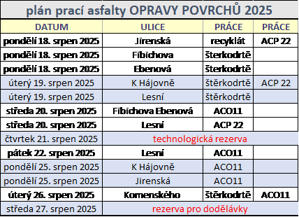 Od 18.8. 2025 budou zahájeny FINÁLNÍ práce na opravách komunikací K Hájovně, Lesní, Fibichova, Ebenová a Komenského. Práce budou probíhat postupně viz přiložený plán prací.